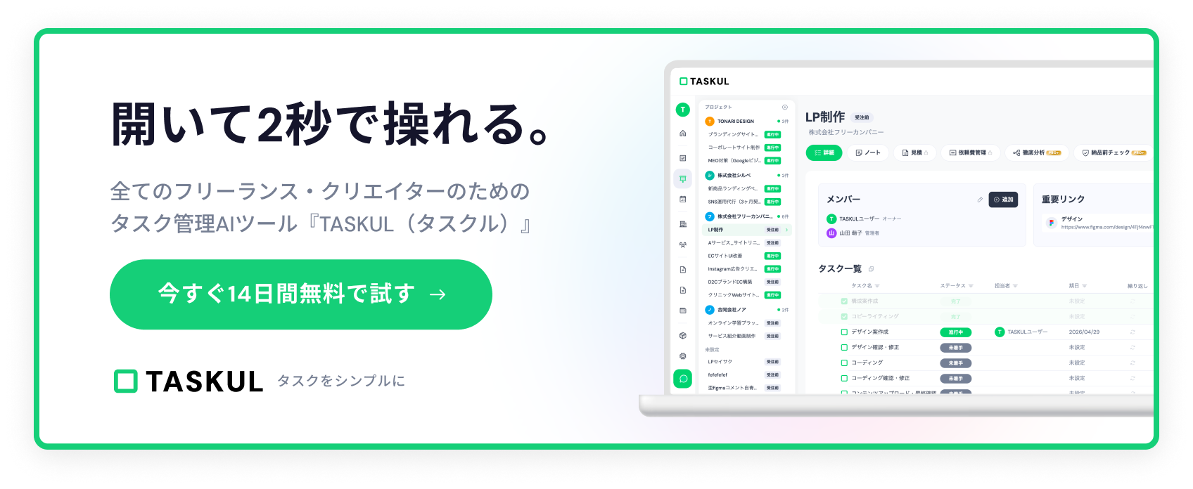 TASKULは、フリーランス・クリエイター専用に設計されたAI案件管理ツールです。