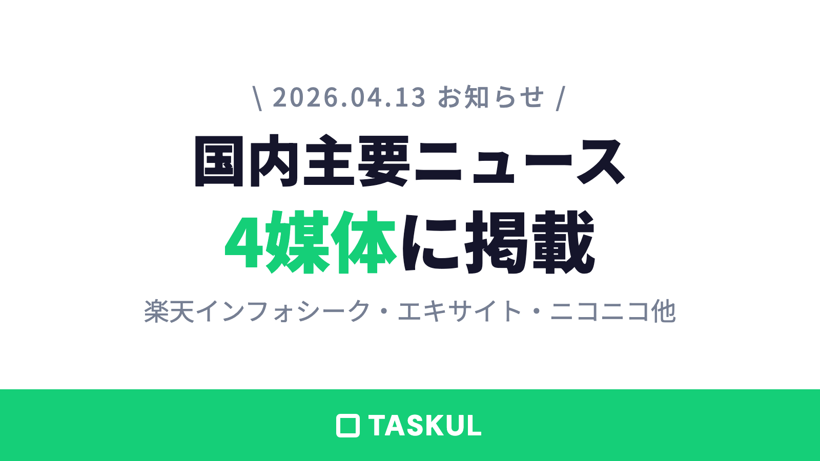 フリーランス・クリエイター向けAIタスク管理ツール 「TASKUL(タスクル)」 が、2026年4月13日、国内主要ニュースメディア4媒体にて同時にご紹介いただきました。日頃よりTASKULをご利用・応援いただいている皆さまに、心より御礼申し上げます。